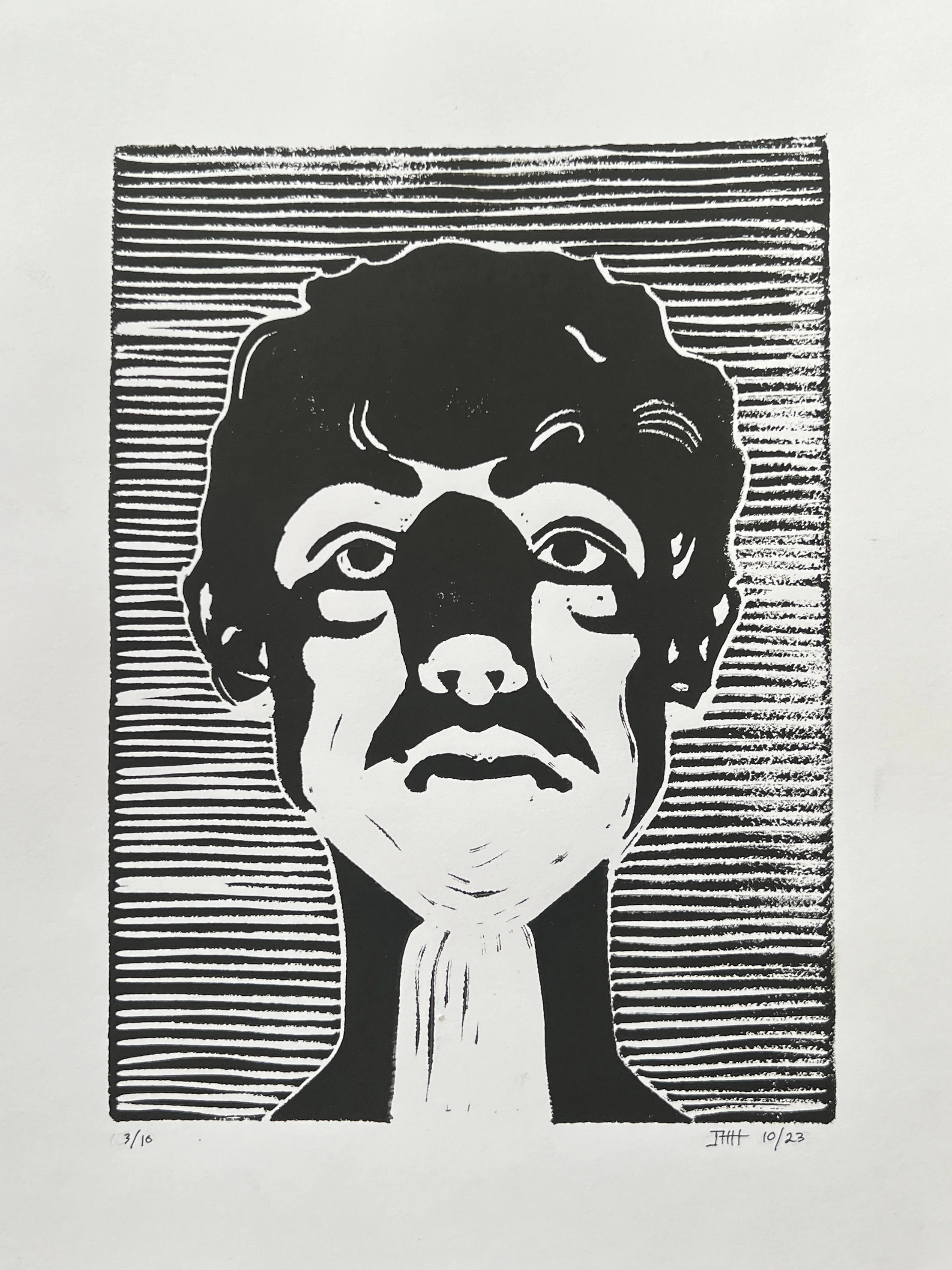 I specialize in linocut printmaking and gravitate towards portraits. Interesting shapes, shadows, and perspectives are my go-to style.. All prints are for sale!